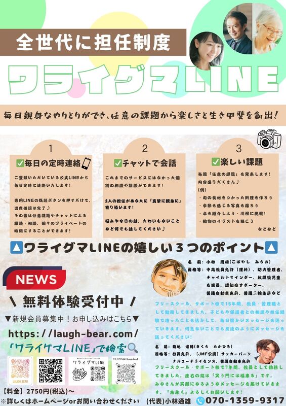 そして、私たちワライグマLINEは「全ての人に担任を。」をキャッチフレーズに、オンライン担任が毎日あなたやあなたの家族を見守るサービス(オンラインスクール)です。